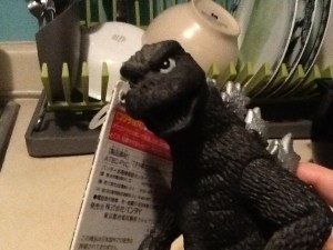 As a child I cried whenever Godzilla was killed in the movies.  What a sad, misunderstood gorilla-whale.  I bought my Godzilla for $18.  Probably not a deal; he’s from Japan, which makes all toys expensive, but he was a bit dusty, which usually makes toys free.  But he wasn’t that dusty.  I chose this one, because it has a “puppy face” (the words of the man who sold it to me).  Very happy with my purchase, and the vendor was super friendly.  Gojira now guards my apartment.